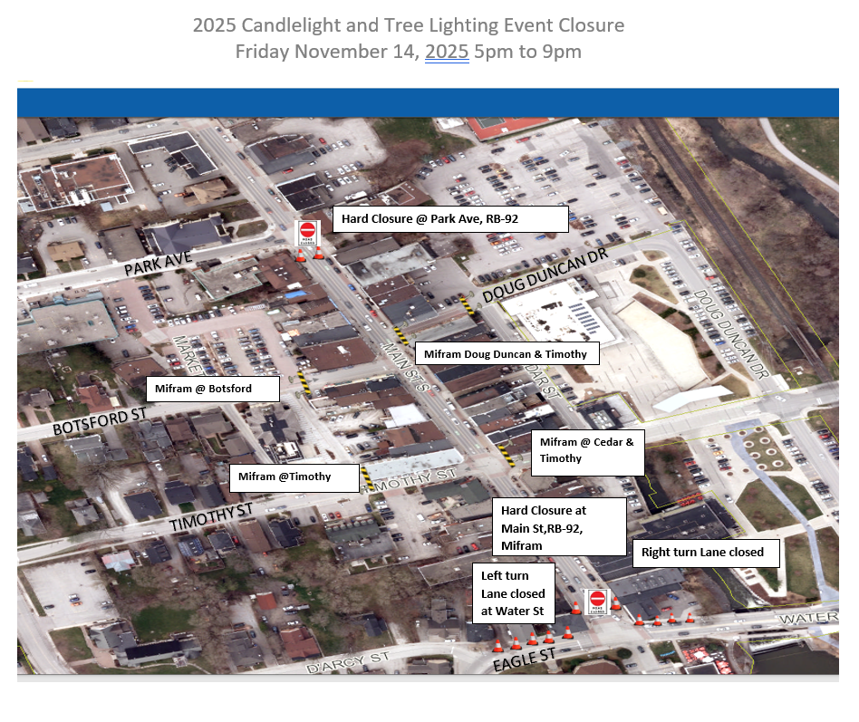 On Friday, November 14, Main Street from Water Street to Park Avenue will be closed from 5 to 9 p.m. for the Main Street Candlelight Parade and Tree Lighting.